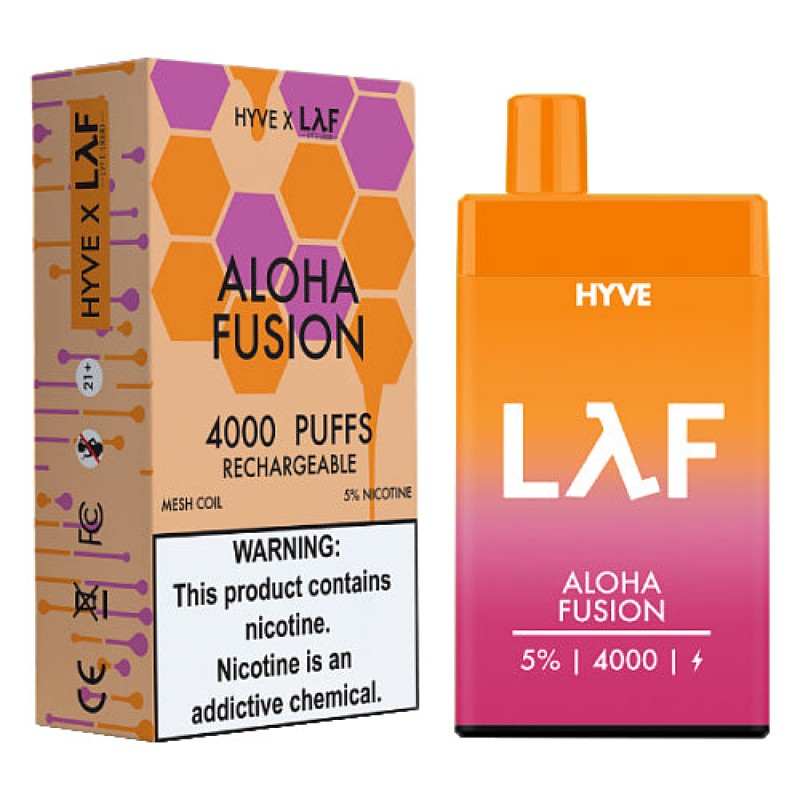 The Aloha Fusion Hyve 4K Disposable Vape has a rechargeable lithium ion battery, holds 10ml of 50mg nicotine strength salts, and generates an estimates 4000 puffs.